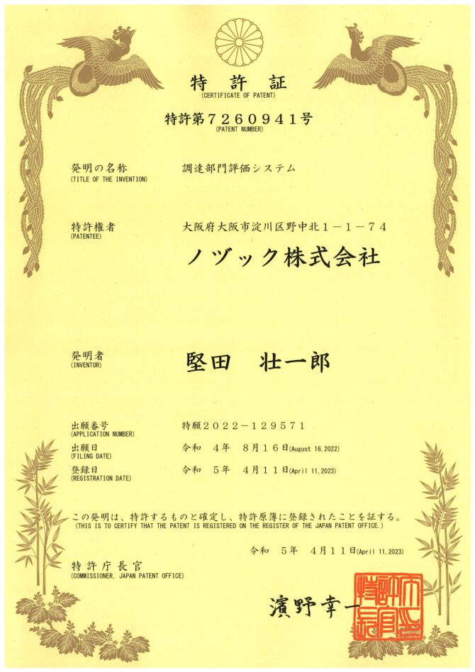 2023.06.15 お知らせ ビジネスモデル特許を取得しました この度、ノヅック株式会社は『調達部門評価システム』で2023年4月11日にビジネスモデル特許を取得しましたことをお知らせします。(特許番号:特許第7260941号)モノヅクリ業界発展のために、今後も革新的な仕組みづくりを続けていきます。 ‹ 前の記事へ 記事一覧へ 次の記事へ ›